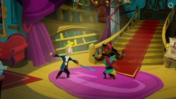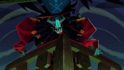 Très vite, Guybrush va devoir affronter LeChuck. Ou plutôt, réussir à infiltrer son équipage pour faire route vers Monkey Island et le doubler dans sa quête. L’occasion de découvrir une flopée de nouveaux antagonistes hauts en couleurs et dont la verve légendaire de Ron Gilbert (aidé par Grossman) transpire à chaque phrase. Des boutades, de longues tirades, des vannes improbables et des ruptures comiques rassurent, l’ambiance de MI est de retour. Il faudra néanmoins passer un premier stade d’adaptation au début du jeu: les graphismes ont résolument évolué. Pas de retour en pixel art malheureusement, même si cela est compréhensible pour toucher un plus grand public. Guybrush et ses amis sont presque des dessins animés en celluloïd, un style plus abstrait et enfantin, avec un léger grain à la Guacamelee. Si on pense très vite ne pas réussir à faire abstraction de ce changement, il faut avouer que c’est moins pire que prévu, et même assez agréable lorsqu’on prend le temps de contempler les multiples décors qui seront proposés. D’autant que notre pirate va effectuer un très long périple, retrouvant, là encore, des îles qui ont fait partie de la saga ancestrale.