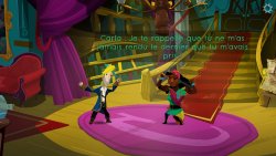 Vous incarnez donc deux jeunes qui jouent au pirate dans une fête foraine. Un passage relativement court qui permet surtout de découvrir les mécaniques du jeu dans un tuto, et la première petite déception: l’inventaire à la SCUMM ne revient pas. Exit les mots à sélectionner, on est désormais sur le traditionnel clic gauche pour aller sur un point et prendre l’objet, clic droit pour l’utiliser avec la meilleure action contextuelle. L’inventaire est un sac à dos qui doit s’ouvrir pour piocher dedans les items. Certes, Terrible Toybox (le nouveau développeur) use et joue de clins d’œils pour nous remettre quelques astuces de l’époque (comme des passages dans le noir où on ne voit pas vraiment ce que l’on fait, des actions contextuelles idiotes ou des réflexions de Guybrush sur des décisions bizarres), mais il y a une sensation de passage de témoin vers la nouvelle scène du point & click. Monkey Island n’est plus en position d’inventeur du genre, il se met dans les habits d’aujourd’hui en incarnant la mode actuelle.