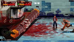 Au début de la partie, il faut donc choisir quelqu’un parmi ces gitans. Naturellement, ce fut Boris, car j’aime l’imprévisible. Côté prise en main, c’est parfait. On tape, on court, on saute, on ramasse armes et on peut même pomper de la Nekro chez les ennemis agonisant, ce qui a pour effet de remplir la seringue qui représente la jauge de santé du joueur. Dans l’ensemble, la jouabilité à la manette se déroule sans accroc mis à part quelques moments hasardeux dans lequel on ne comprend pas comment on a pu louper l’ennemi ou comment lui a pu nous toucher. Le sang coule à flots et le spectacle devient grandiose lorsque la jauge de Nekro permet d’entrer en furie, le gitan contrôlé devenant ultra puissant, rapide et encore plus violent. Le concept est on ne peut plus simple donc : on bastonne, on pompe un peu Nekro dans un coin et on continue de défourailler. Pas de mécanique de jeu complexe, pas de réflexion, juste de la bonne foire d’empoigne comme on l’aime.
