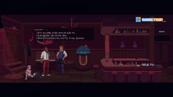 Malgré tout, ça s’améliore un peu par la suite. Vous incarnez un patron de bar dans un point & click pixellisé en 2D qui rappelle la dernière création de Deconstructeam, c’était Gods will be watching. L’univers est typique du cyberpunk. Pour les néophytes, le concept global de ce genre d’univers, c’est la présence de mégacorporations, des genre de conglomérats qui dirigent et dominent le monde, alors que les héros sont souvent dotés de capacités cybernétiques tout en gardant un style punk (Blade Runner, Total Recall, par exemple). Ici, on n’échappe pas à la règle, l’esthétique est entre le rose et bleu saturé des productions des années 80, mais aussi la crasse ambiante du punk des bas-fonds. On comprend vite que le patron de bar, et son acolyte qui se rince le gosier, est un négociant en information. Son but est de soutirer des infos pour empêcher ce qu’ils considèrent comme des terroristes de rendre la population servile.