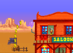 Ce n’est pas tout niveau contenu, puisqu’au delà de la très bonne variété des niveaux, vous rencontrerez quelques boss, certains en 3D avec vue à la troisième personne, mais aussi des mini-jeux comme le bras de fer avec Jolly Jumper, une partie de cartes contre Pat Poker et j’en passe. Vous pourrez également tenter de toucher le plus de bouteilles possible dans un saloon, face au bar, pour gagner encore plus d’argent. Ces différents mini-jeux sont assez bruts, sans aucune aide, impossible de savoir quel bouton permet d’engager le bras de fer contre le canasson, par exemple.