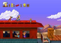 Un niveau cauchemardesque.La difficulté évolue de manière croissante au fil des niveaux, les ennemis devenant plus nombreux ou mieux cachés, sans oublier les phases de plate-forme à s’arracher les cheveux. Lucky Luke peut courir, se baisser, sauter et tirer dans quasiment toutes les directions utilisant parfois même le décor pour faire des ricochets et atteindre ses ennemis. Il possède 3 vies qui peuvent vite disparaître si l’on ne joue pas assez prudemment. Il est important de bien ramasser les étoiles, dollars et autres têtes de Lucky Luke pour bénéficier de points de vie, de vie supplémentaire ou d’avoir la possibilité d’utiliser cette argent entre chaque niveau auprès du marchand ambulant pour acheter des vies ou débloquer le mot de passe, permettant de reprendre à ce niveau en cas de game over.