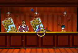 À chaque intermission, on peut faire le plein de vies.Tirer le plus de bouteilles qui volent peut rapporter pas mal de billets verts..La fameuse poursuite du train.Certains PNJ sont un peu particuliers.Le mini-jeu du bras de fer.Eclate les bouteilles, pas le barman!La 3D, un peu discrète.Le saloon, évidemment.Sauter pour le flouze?
