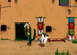 Lucky Luke aide la veuve et l'orphelin.Lucky Luke propose donc aux joueurs de la plate-forme, un peu de réflexion, de l’action et surtout beaucoup de précision. Le niveau de dextérité nécessaire est dans les standards des jeux de cette époque, surtout de ce type sur la Playstation. Crash Bandicoot n’est finalement pas plus facile à jouer quand on y repense. Le summum est atteint vers la moitié du jeu, dans le village peuplé de fantômes et de trous, dans lequel il faut rebondir sur des peaux de bêtes tendues et retrouver les esprits du village égarés, représentés par des orbes bleus. Cela ne s’arrête pas là, les retrouver ne suffit pas, il faut les atteindre et dans un certain ordre, avec aucun indice évidemment. Entre les ennemis, les trous, les effets de profondeurs, ce niveau se révèle être un véritable cauchemar, dans la lignée de Tintin au Tibet sur Megadrive, développé par… Infogrames.