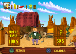 Le fameux mot de passe pour reprendre sa partie.L’aventure démarre dans une bourgade du grand Ouest américain, typique des westerns. Saloon, maisons colorées, tout y est. Lucky Luke traversera également un village mexicain hanté, partira à la poursuite d’un train, ira dans le désert et même dans une mine abandonnée. Les décors s’avèrent plutôt variés, colorés et très agréables, on se croirait dans la BD, sans les bulles, mais avec des animations. Lucky Luke affrontera des desperados, d’autres cow-boys, des bûcherons et bien sûr les frères Dalton, un à un. On retrouve bien évidemment Jolly Jumper tout au long du jeu, Rantanplan, qui sert de checkpoint dans les différents niveaux, mais aussi le Croque-Mort ou encore Pat Poker.