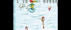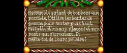 Une image tirée de la VHS?Concrètement, on apprécie que les grands moments du film soient reproduits dans le jeu, les graphismes plutôt colorés sont agréables et Buddy doit manger tout un tas de bonbons pour augmenter sa jauge de vie. Les niveaux proposent différents challenges, comme de la plateforme, de la dextérité (la descente sur une plaque de glace), de la réflexion (la livraison du courrier) et de la précision (la bataille de boules de neige). En revanche, la jouabilité s’accorde avec tout ça comme du saucisson avec du vin chaud. Les commandes sont simplissimes (on s’oriente et on saute ou on court) mais la précision est tout bonnement affreuse sur les niveaux qui ne sont pas de la plateforme classique. Le saut de bloc de glace en bloc de glace est un calvaire, cela se joue au millimètre.
