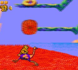 Un drôle de niveau, sans logique.Simba d’ailleurs, parlons-en. Il saute et retombe avec ses griffes, il peut rugir et se rouler en boule. Il s’accroche où il peut pour grimper et se balance à différents points d’accroche pour ensuite se projeter. Petit écran et capacités techniques plus limitées oblige, la progression est un peu plus chaotique. Le Roi Lion est sans pitié, un game over et c’est le retour au début. Le petit écran de la Game Gear nuit à la progression, mais ne mettons pas ça sur le dos de la console mais plutôt sur celui des développeurs. D’autres jeux du même genre s’en tirent bien mieux. Les passages avec saut de girafe en girafe ou lors de la phase Hakuna Matata sur des hippopotames vers l’inconnu ruinent l’expérience et peuvent provoquer un rage quit, pour peu que l’on soit à sa dernière vie…