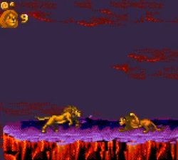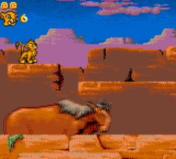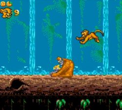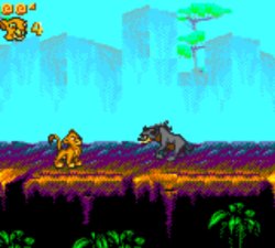 Une scène du film plutôt bien rendue.Les ennemis s’avèrent plutôt variés, on croise des insectes peu dangereux, les fameuses hyènes, des vautours ou encore des araignées, assez pénibles à éliminer. Trois boss viendront vous barrer la route: une hyène, un orang-outan sorti du Livre de la jungle et le fameux Scar, dans un combat finalement peu difficile, comparé au reste du jeu. On notera la présence de Pumba lors d’un mini-jeu bonus intervenant entre deux niveaux, dans lequel il faut déplacer le phacochère d’un côté à l’autre de l’écran pour attraper de la nourriture en évitant les insectes peu ragoûtants, permettant ainsi de gagner une précieuse vie supplémentaire. La bande-son respecte plutôt bien l’univers du film et les graphismes sont plutôt corrects.